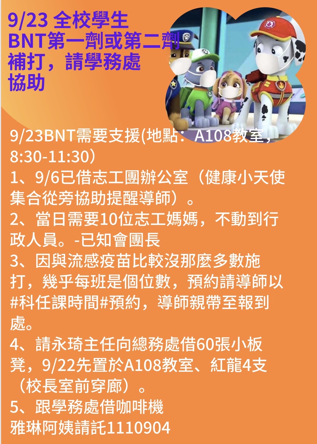 1110906請班級有學生要打BNT學生的健康小天使(請假派…長也可)到志工團集合說明9/23前置作業,從旁協助忙碌教學的導師 FB 相簿